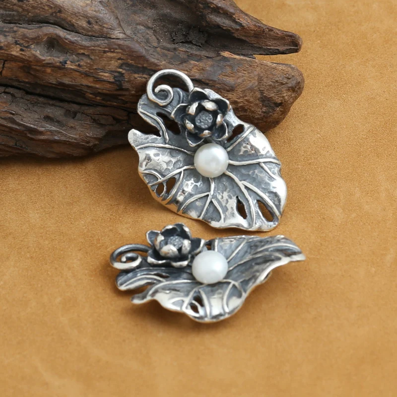 Vintage China Style Silver 925 Lotus Leaf Natural Pearl Pendant For Necklace Women Handmade 925 Ste