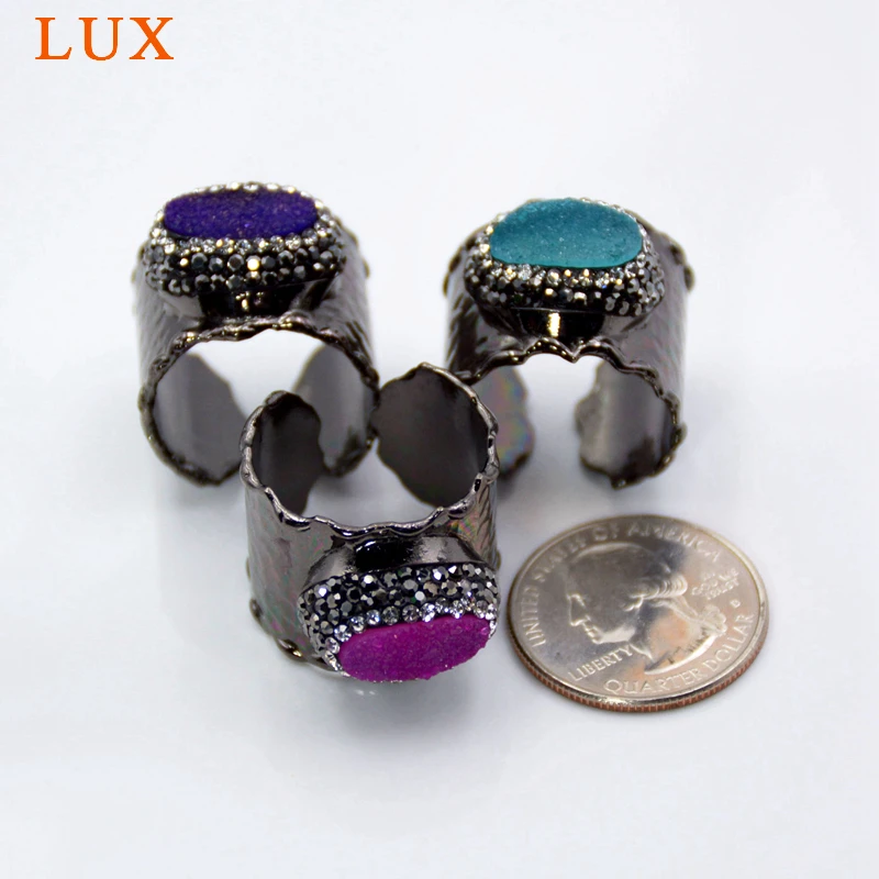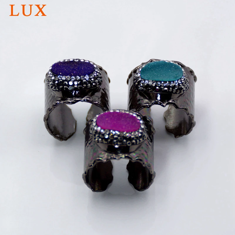 HIGH QUALITY 5PCS Natural druzy marquise shape agates drusy jewelry pave rhinestone jewelry black band ring fash