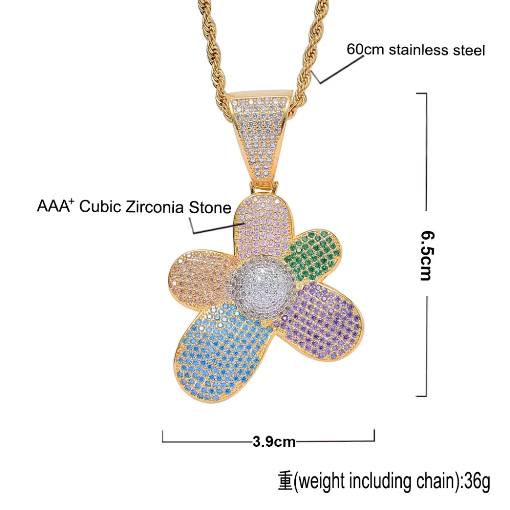 ORIGINAL Colorful Hip Hop Flower Jewelry Micro Pave Iced Out Rainbow AAA+ Cubic Zirconia Flower Pendant Neck