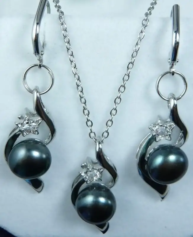 Women's gift Jewelry WGP word Natural Fine Pretty!Black Akoya Pearl Necklace +Earring Set ** plated