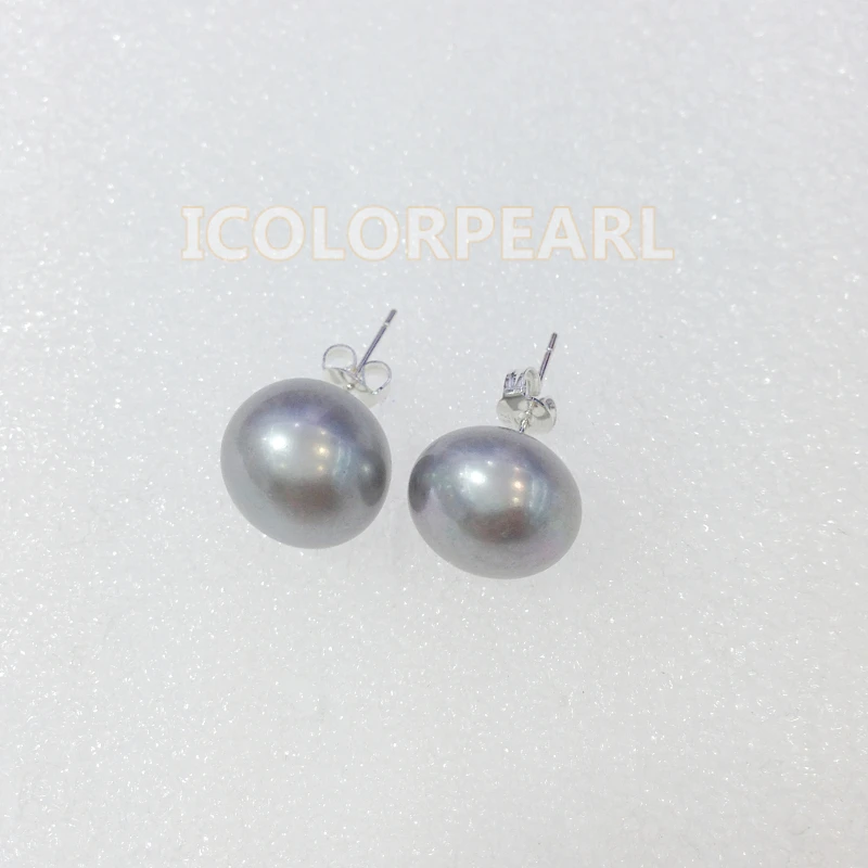 ORIGINAL WEICOLOR Big 11-12mm Semiround Grey Freshwater Pearl Jewelry Earrings Studs With Silver Pins.Best G
